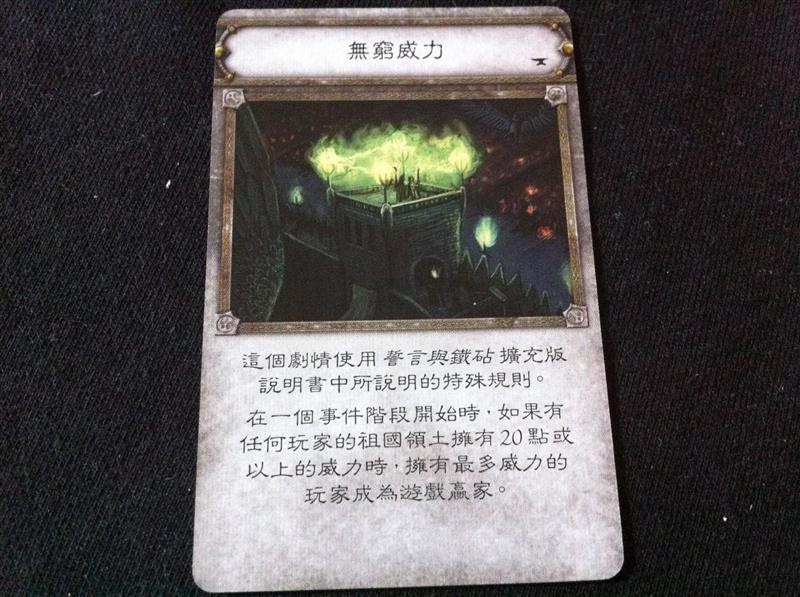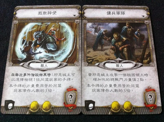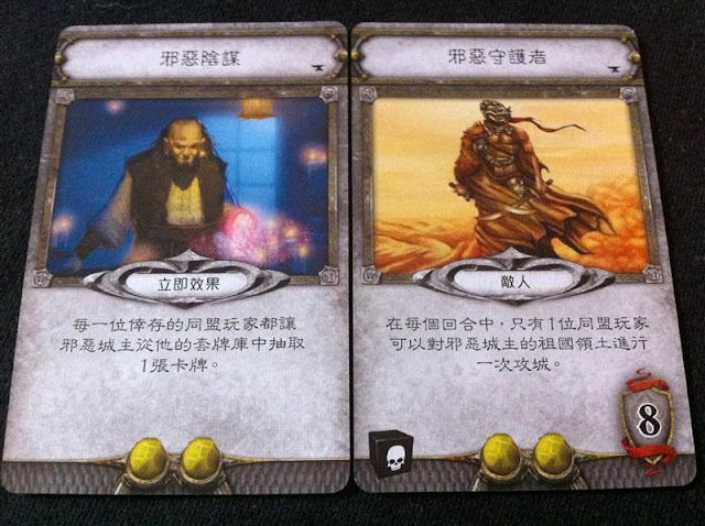 【圖解】光閱讀目標卡上的描述就可以知道劇本的主要任務內容 ,在邪惡崛起所扮演城主的玩家,必須搭配「事件卡」來壯大自己所以這位玩家必須對事件卡有一定的認知。而領主有個特別棄牌規則,在每次同盟玩家的遊戲輪時,邪惡城主可以選擇棄掉他的整副手牌,然後補手牌。