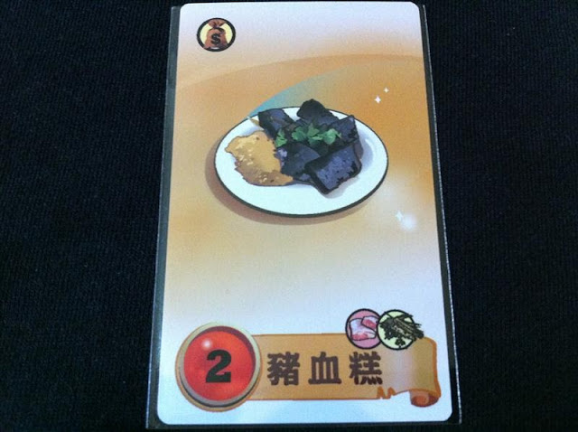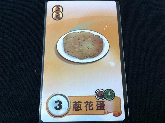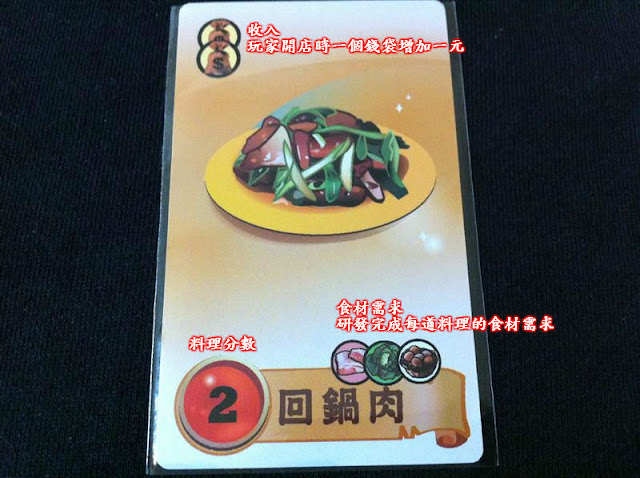 【圖解】食譜研發後便成為料理,錢袋多的料理可幫助玩家開店時增加「收入」;想完成料理就必須符合「食材需求」,像這道「回鍋肉」就必須有蛋、菜、肉才可完成。(在一般規則不可研發相同料理,但進階規則可以)