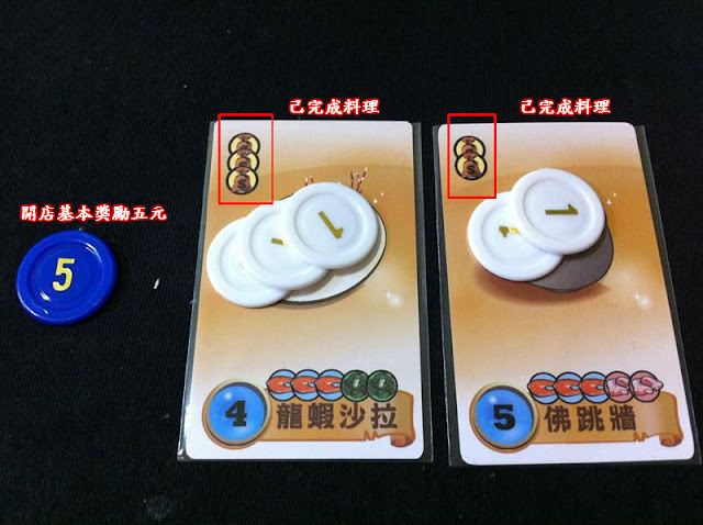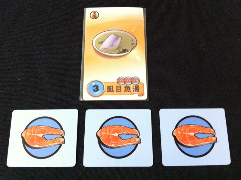【圖解】如果玩家在這時有三塊「魚」就可以完成這道「虱目魚湯」把這道料理放置在自己的面前,然後把三塊「魚」棄掉。