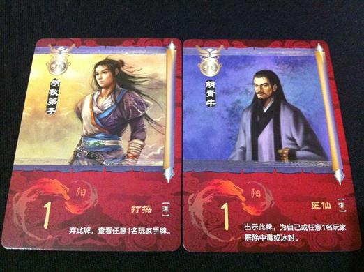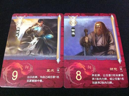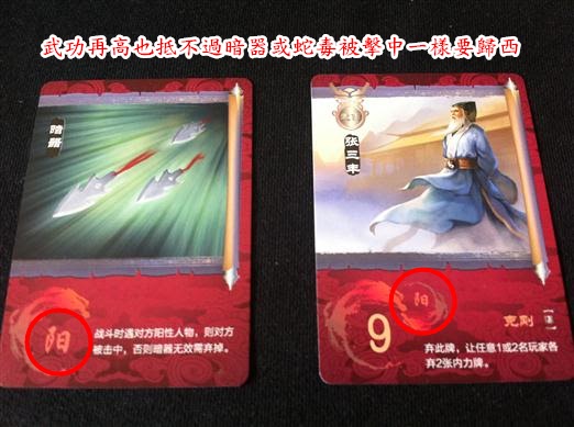 ◎暗器與毒-暗器與毒都分為陰、陽二種,當攻擊時只要合對方人物屬性相通就算命中。暗器可讓對方失去人物(棄掉);蛇毒可讓對方手牌上限-1,遊戲中的手牌就等於玩家的體力所以是非常有威力的。