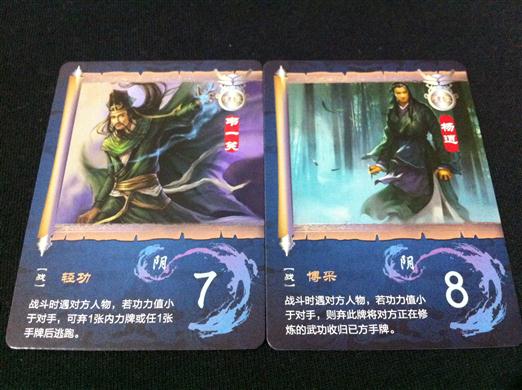 ◎人物牌-每張人物牌陽或陰任一種屬性,是在搭派任一武功時會增加額外的攻擊力或防禦力。而每個人物都有自己功力大小範圍為1~9,有些人物對有戰鬥技或謀略技。