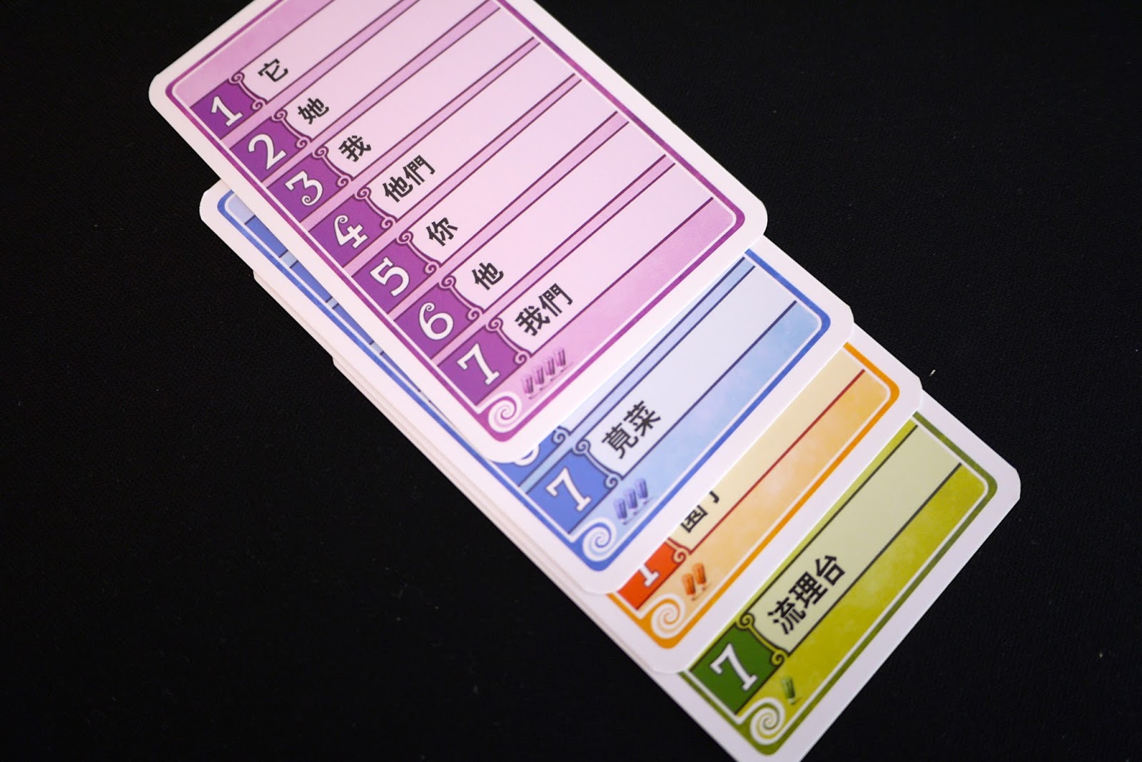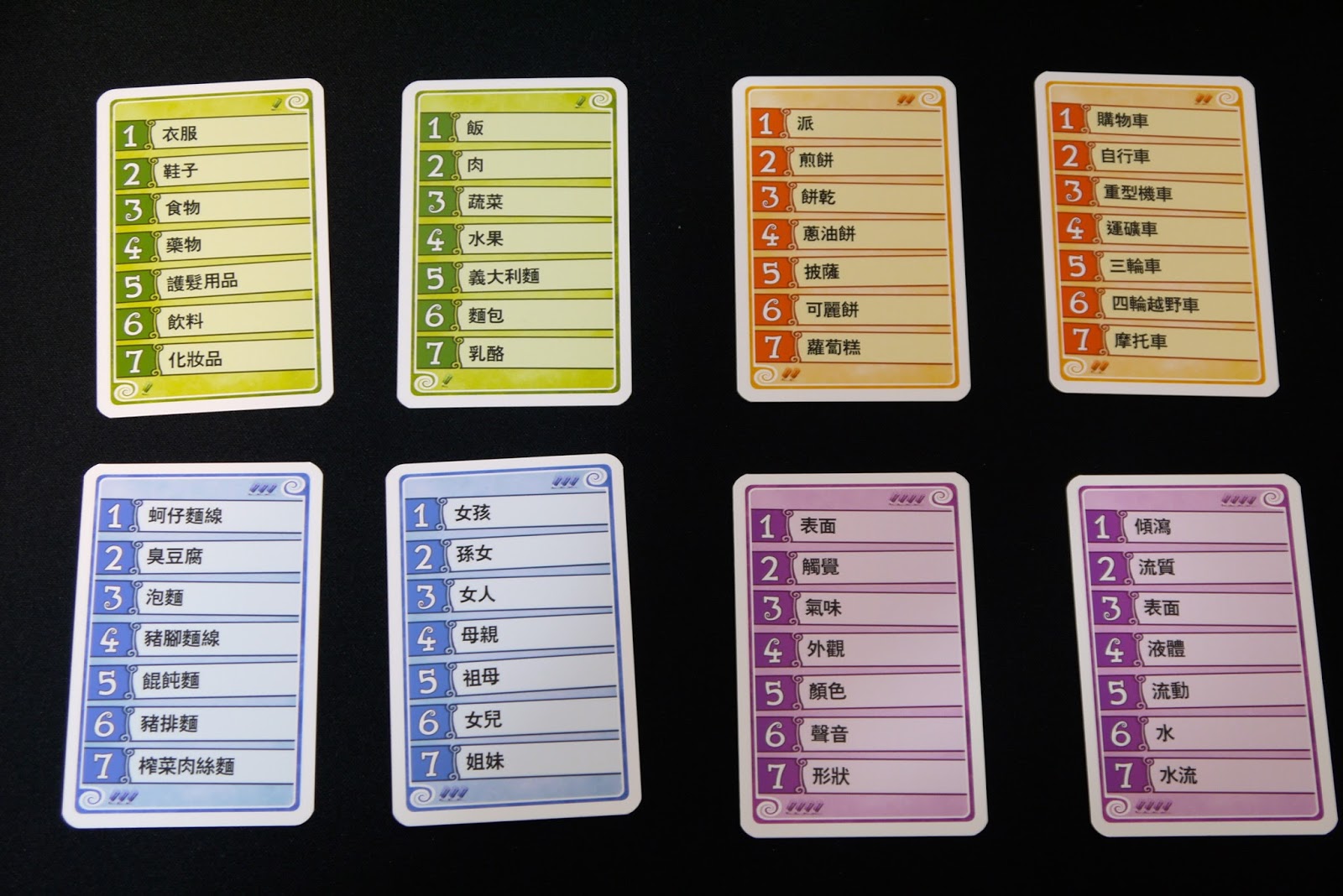 | 遊戲的重點就在於題目卡囉!雖然這套遊戲可以簡單自製, 不過作者設計過的題目卡,難度想必是有經過平衡的。 |