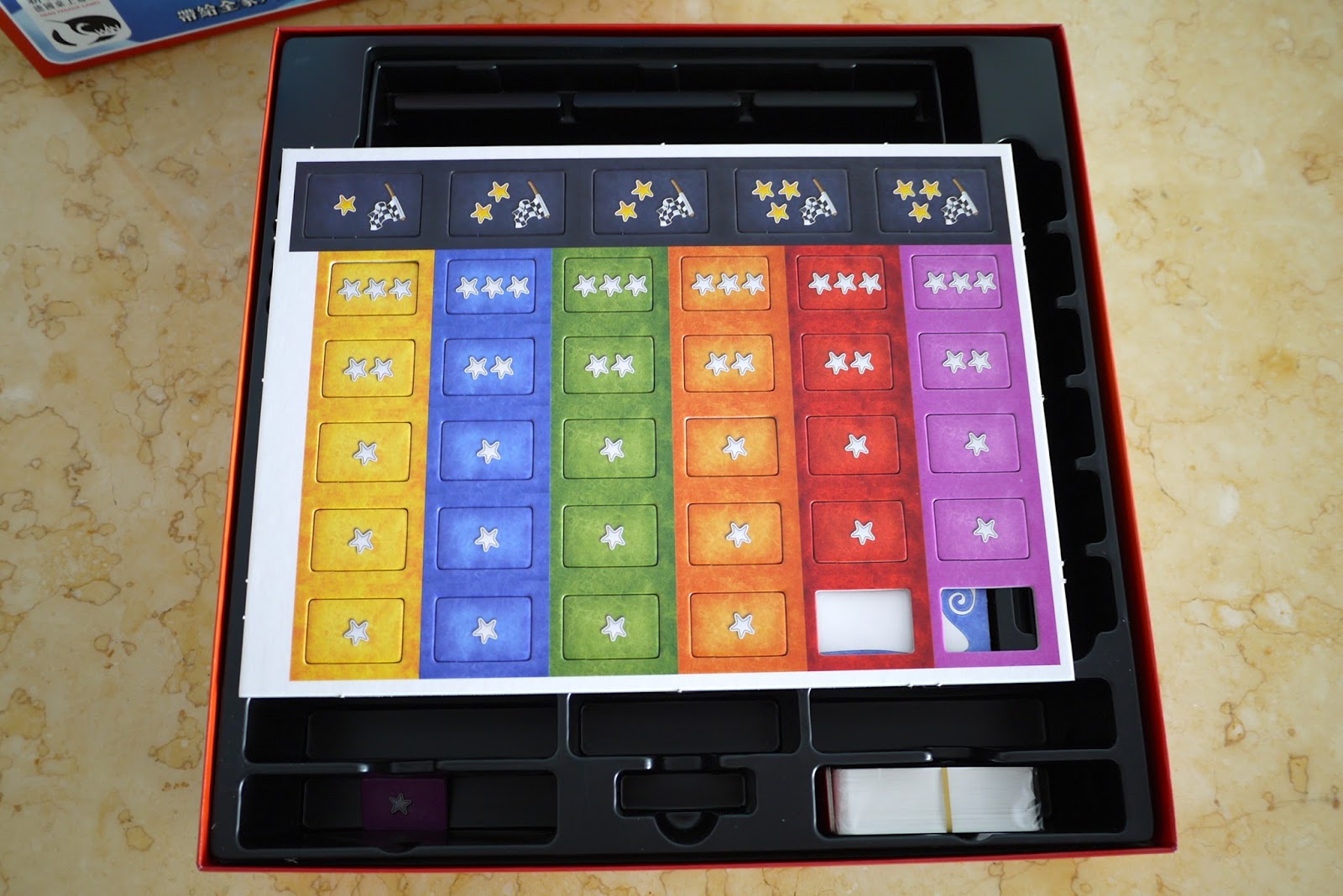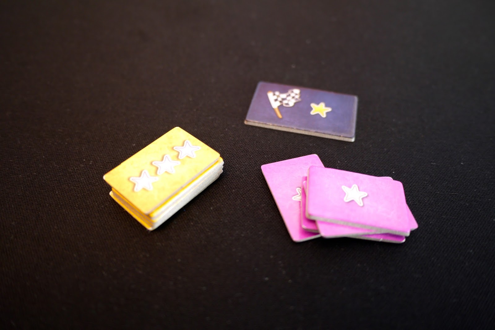 | 分數版塊,每位玩家拿取自己的顏色,可以3-6人玩。不過這些 分數盡量要給別人猜對,拿走,回合結束留在自己手上可是要扣分的! 這張圖可以看到Token的厚度;上面是先完成的獎勵分。 |