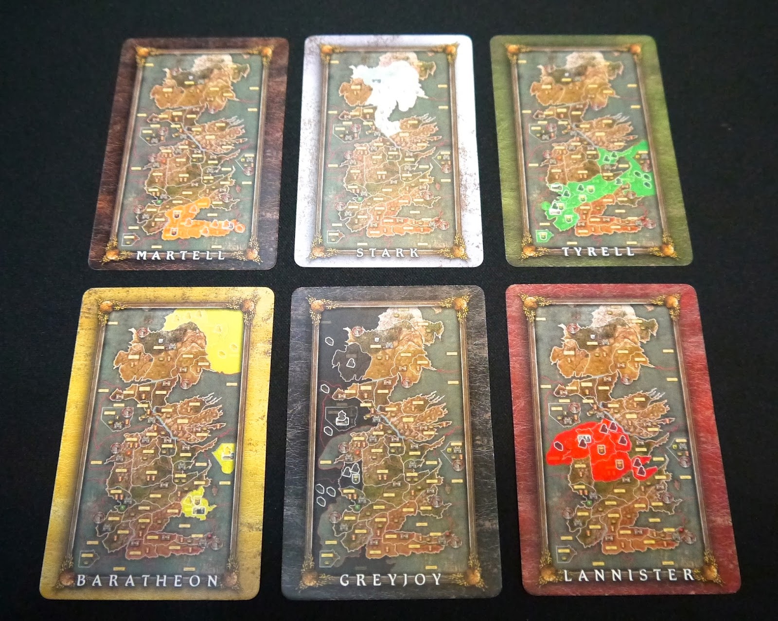 (底線者為遊戲配置)白狼史塔克家族少狼主於「腥紅婚禮」慘遭背叛,大部分將領遭到殺害,北方人馬、土地落入波頓家族手中,故遊戲里,白色家族卡整個被的波頓人馬給取代;黃色耿直的史坦尼斯˙拜拉席恩則是收到了北方「守夜人」的請求,即使在黑水河之役敗陣下來,仍派兵北上,協助守夜人防守「野人」的難侵,終究是防守著了維斯特洛人的長城陣線,接收了守夜人軍力後,分布於龍石島南至風息堡,北至長城。紅色和綠色的藍尼斯特、提利爾家族結成暫時的同盟,共同統治(基本上是由藍尼斯特當家,提利爾則窺伺一旁)維斯特洛首都:「君臨城」,兩家族在中土的聲勢壯大,是不是能誓守蒙約,共創山河,就得交由玩家決定。黑色的葛雷喬伊,則在攸倫˙葛雷喬伊接掌了大軍後,繼續他的江山大業,企圖完成鐵民長久以來的夢想。橘色馬泰爾家族在這裡還是於南方,暗自進行他們的計謀(這裡第四部翻譯的超爛的,有看沒有懂!)。