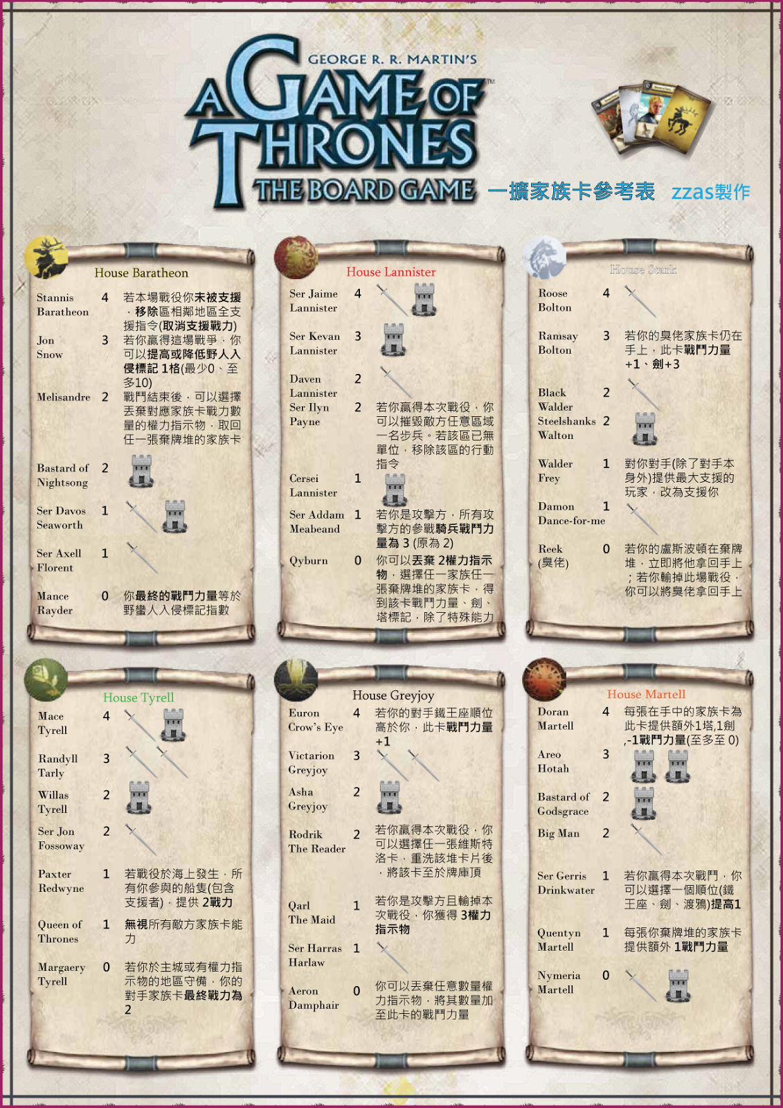 最後,在玩「權力遊戲」時,雖然沒有什麼文字需求,但總是會想要知道「對手剩下的牌組」,有時候還得跟對手借手牌來看,就製作了這張全彩將領卡對照表,希望可以幫助到各位玩家在運籌帷幄時,更清楚掌握敵情,好做出對的選擇。預覽: