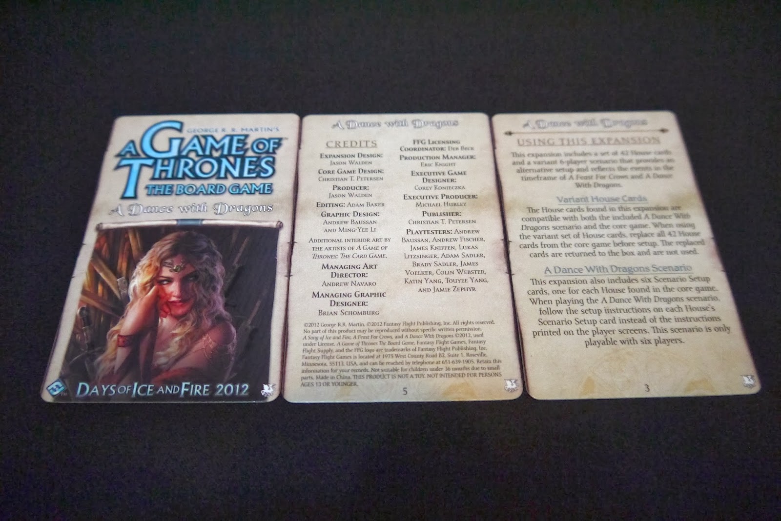 與龍共舞其實算是一款可有可無的擴充,畢竟「冰與火之歌」要開的起來,最重要的就是「玩家」(當然許多遊戲也是,只是這款也特別挑),稍微縮短的遊戲時間,會因為玩家對於局勢的不熟悉而拉長;但是附帶的將領卡,倒是給予玩過不少場次的玩家另一個體驗,將卡片當做一般遊戲中的將領卡使用,整個布局的思維也得改變,尤其紅色的藍尼斯特將領卡有一定程度的補強,黑色則是某種意義上的削弱,讓基本版中,黑紅的勢力不再是一面倒的趨勢。