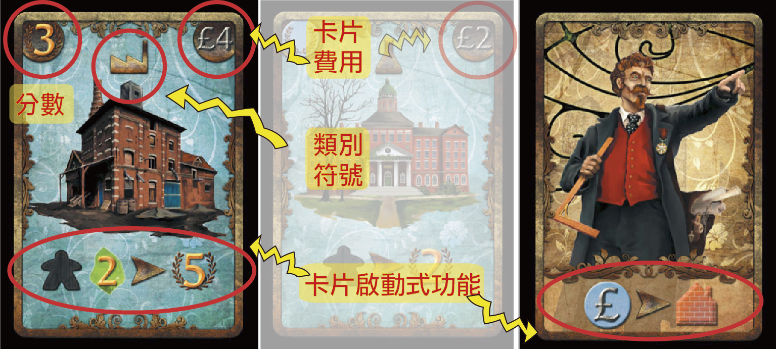 - 將工人收回:賺錢or啟用一張卡片(賺錢端看相鄰的卡片上,有多少工人「還在」上面;啟用卡片除了付出卡片右上方價錢外,還須付該卡片上工人數量的金錢,並且須為你的建築物購買地皮(第幾座便額外付出 0, 1, 2, 3,...元),也可以覆蓋在原有建物上)