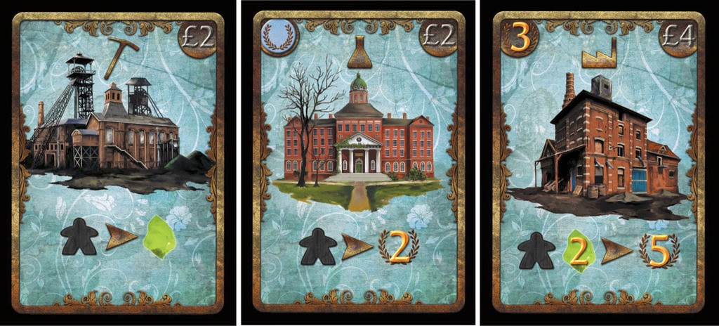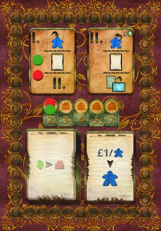 - 「建築」需要有地皮(建設的位置),分成三類,提供密探水晶、消耗工人/密探水晶來換取分數、給予額外工人/前進建築軌的住宅。