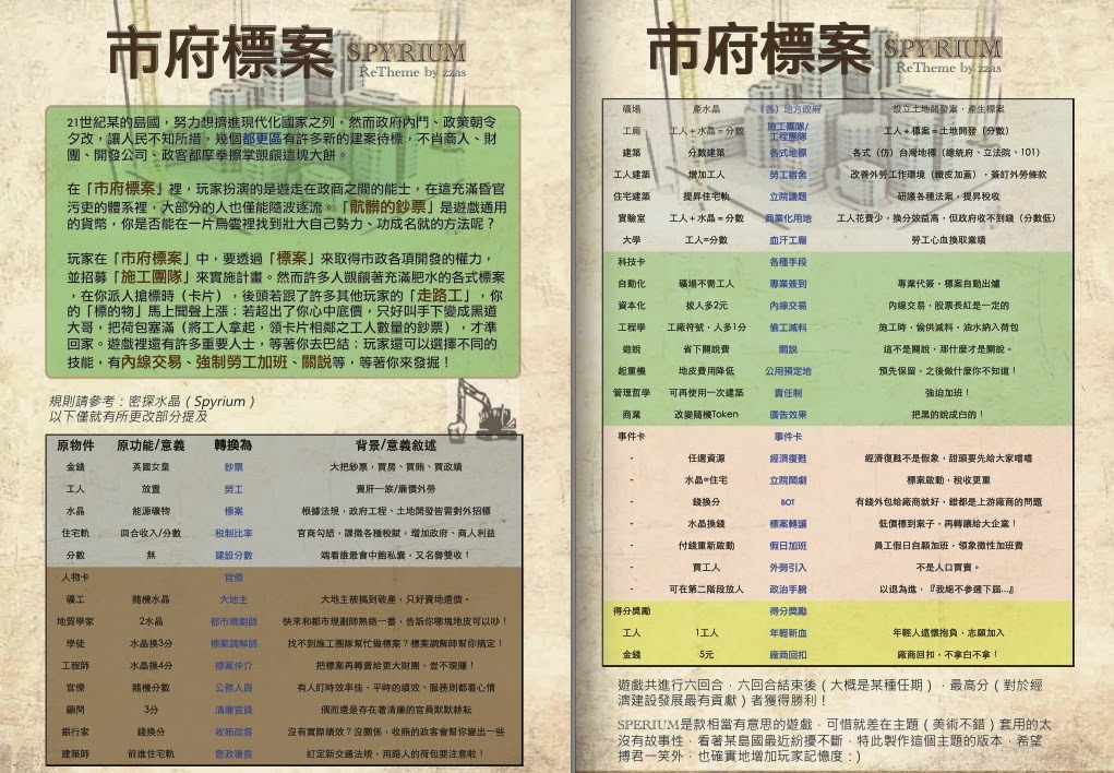 - 台灣的Spyrium:「市府標案」,超Kuso的 Retheme(沿用遊戲規則、機制,但重新設定遊戲主題或美術),你一定要點進來看看!