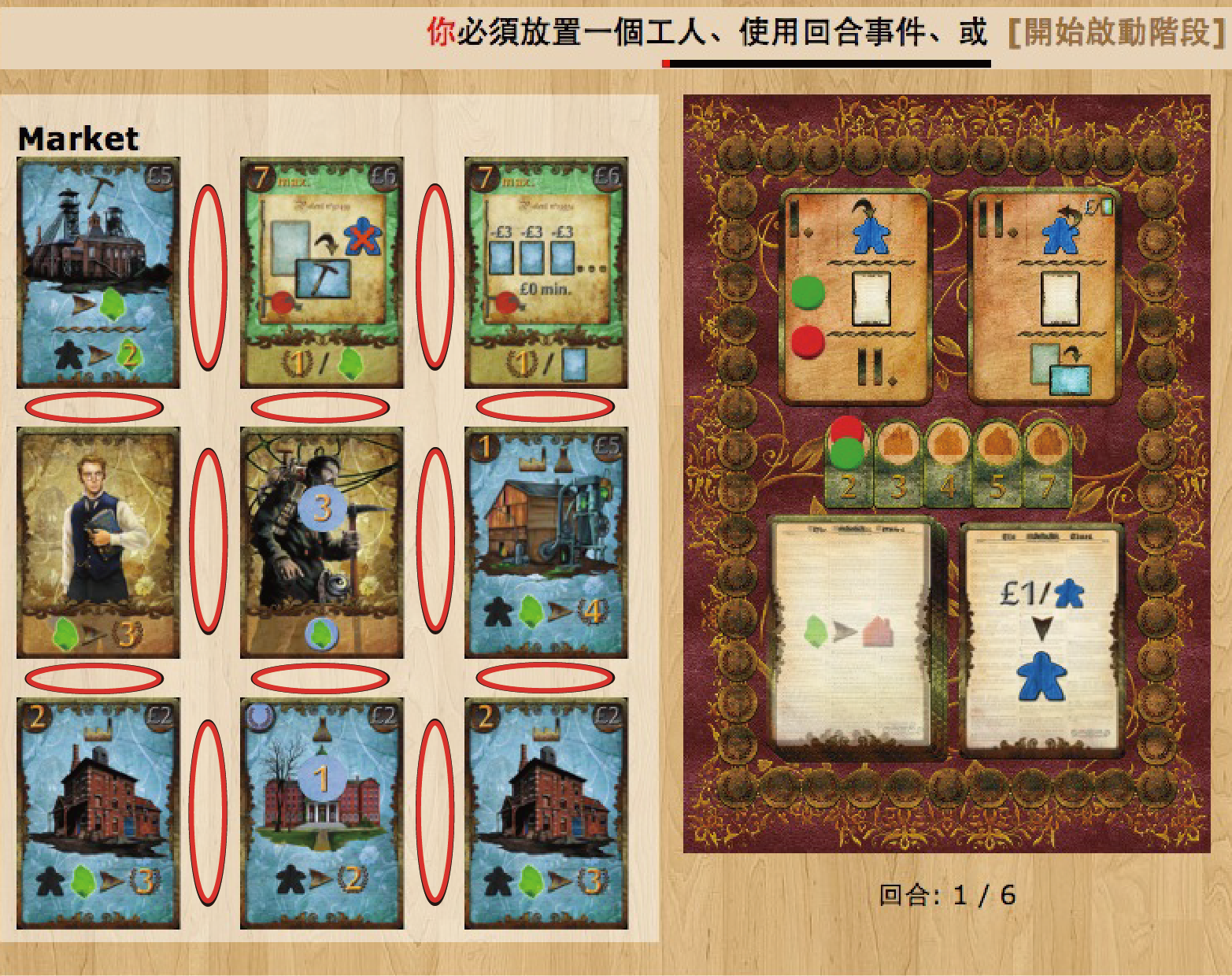 | BGA遊戲介面,特別的地方是「工人放置」要放在卡片與卡片中間(紅圈)! 一旦點選了「開始啟動階段」你的圓盤指示物就會移到右方圖版右側。 |