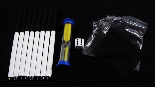配件有 8 隻可擦拭白板筆、一個沙漏 (約 60 秒)、一顆骰子,拭布一包。