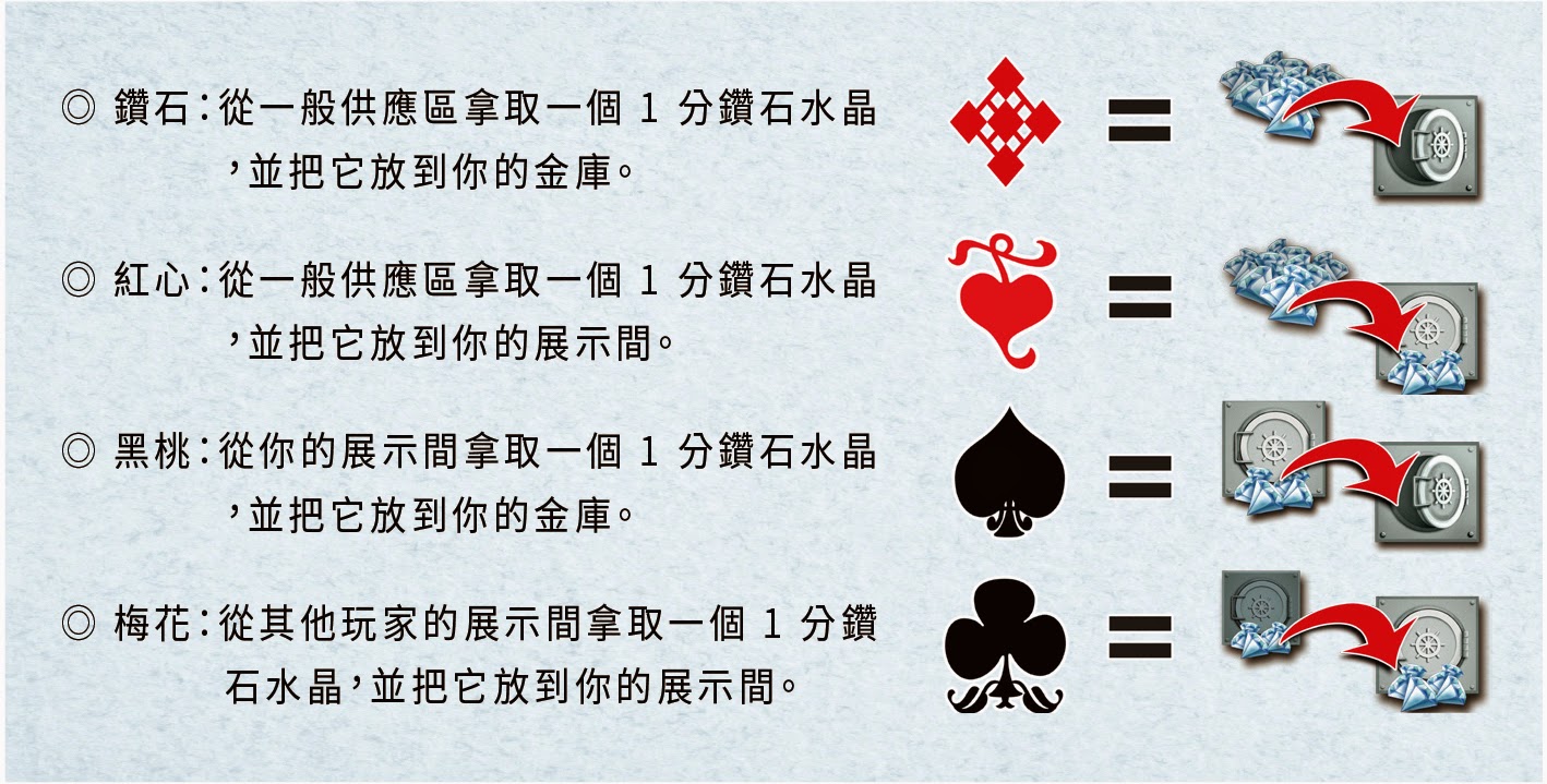 紅心:從一般供應區拿 1 個鑽石到自己的展示間。